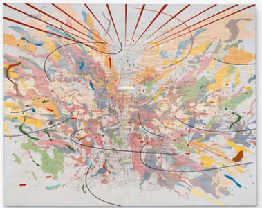 Mehretu begins with the premise of architecture as a medium of social history and power and proceeds to imagine a new present, a fictional topography realized through a formal vocabulary of line, color, gesture, markings, grids, characters, swarms, blurs, washes, which are overlaid and stratified on the surface of the canvas.